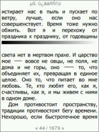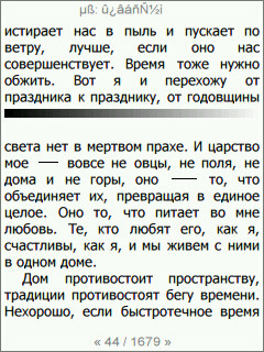 [note balancer 1049348969] !!uBook 0.7a В новой версии 0.7a появилась возможность прокрутки текста «волной»! То есть, пока читаем страницу, сверху на неё наползает новая. Весьма удобно, не приходится задерживаться в конце страницы в ожидании перелистывания, и текст не «плывёт». Кроме того, появилось несколько технических нововведений, которые позволят, вероятно, стать этой программе в будущем более популярной. Например, созданы API для сторонних распаковщиков, графических форматов... Скажем, не сложно представить себе модуль-«архиватор», который из FB2/ZIP будет извлекать в виде HTML... Подробнее - uBook... [/note]